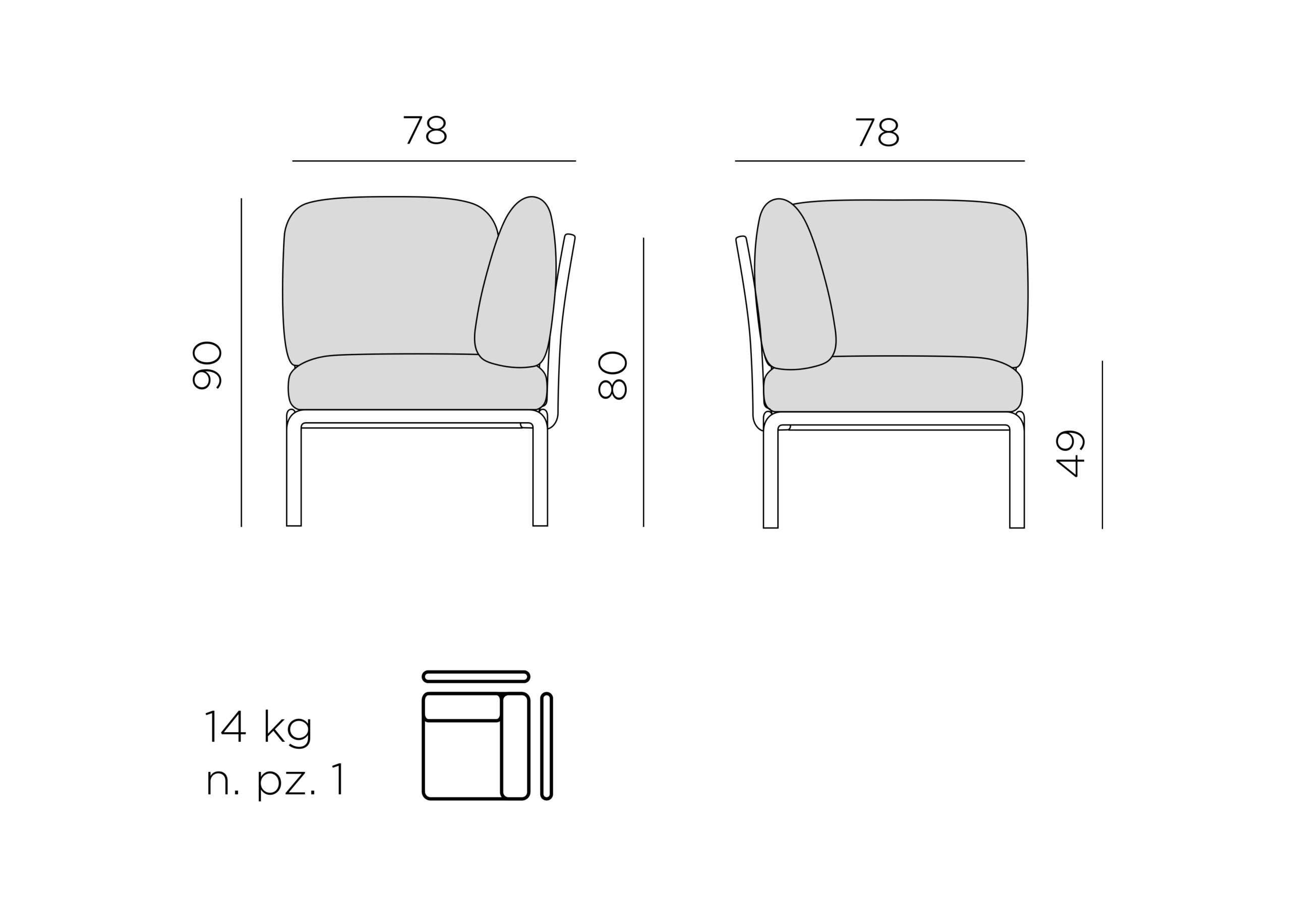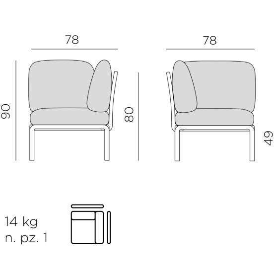 Uwagi: antypoślizgowe nóżki, matowe wykończenie, zdejmowane poduszki, może być częścią modułowej sofy ogrodowej Komodo.