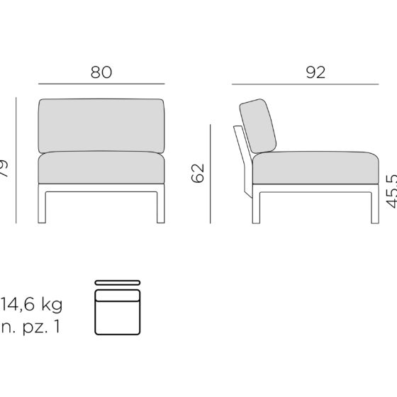 Uwagi: antypoślizgowe nóżki, matowe wykończenie, zdejmowane poduszki, może być częścią modułowej sofy ogrodowej Komodo.
