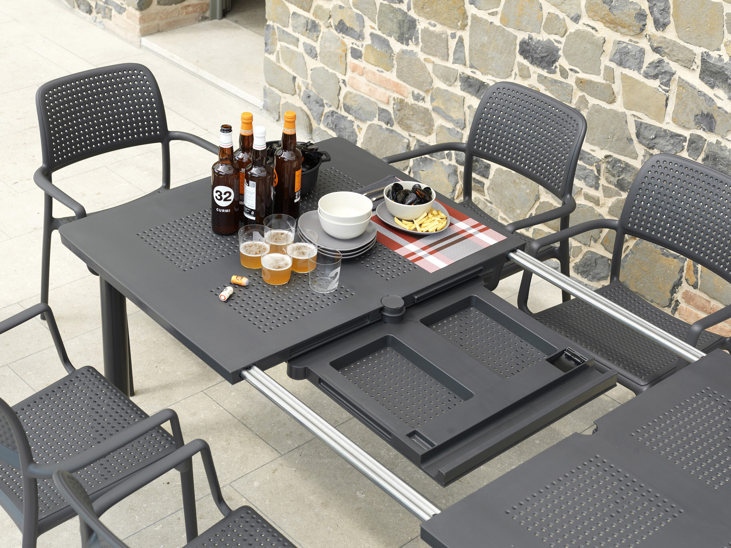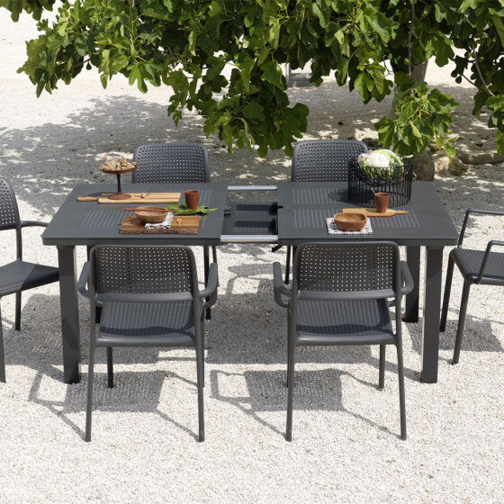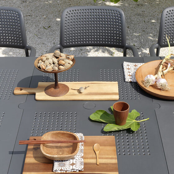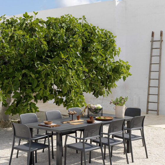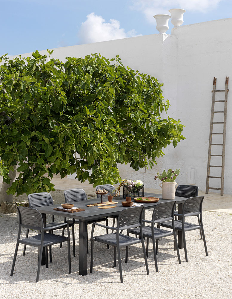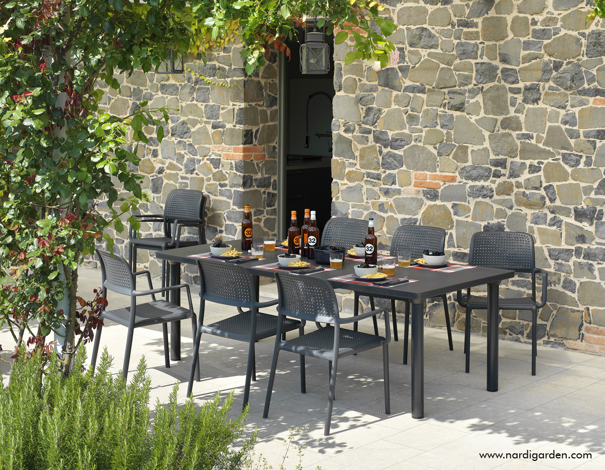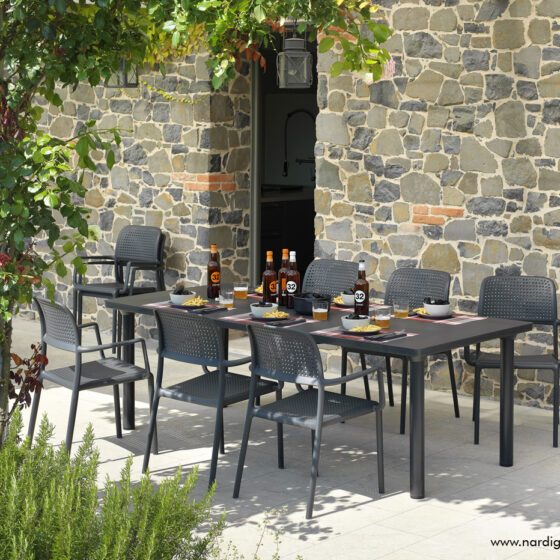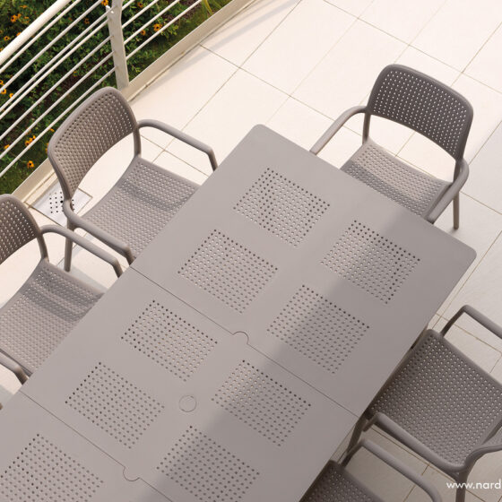Specjalnie wyprofilowana linia oparcia oraz stałe podłokietniki gwarantują wygodę, która sprawia, że stosowanie dodatkowych poduszek jest zbędne. Brak osobnych elementów konstrukcyjnych powoduje, że krzesło ogrodowe Nardi z serii Bora nie trzeszczy i zachowuje pełną stabilność nawet przy dużym obciążeniu w kawiarni czy restauracji. Dzięki możliwości wkładania jednego krzesła w drugie, przechowywanie całego zestawu zajmuje minimalną przestrzeń w schowku lub na balkonie. Antypoślizgowe nóżki pewnie stabilizują mebel na mokrych płytkach i chronią podłoże przed porysowaniem podczas codziennego przesuwania mebli. Potwierdzeniem wysokiego standardu wykonania jest certyfikat CATAS przyznany przez Włoski Instytut Badawczy, który dopuszcza ten model do użytkowania w restauracjach, kawiarniach, hotelach oraz innych obiektach publicznych.