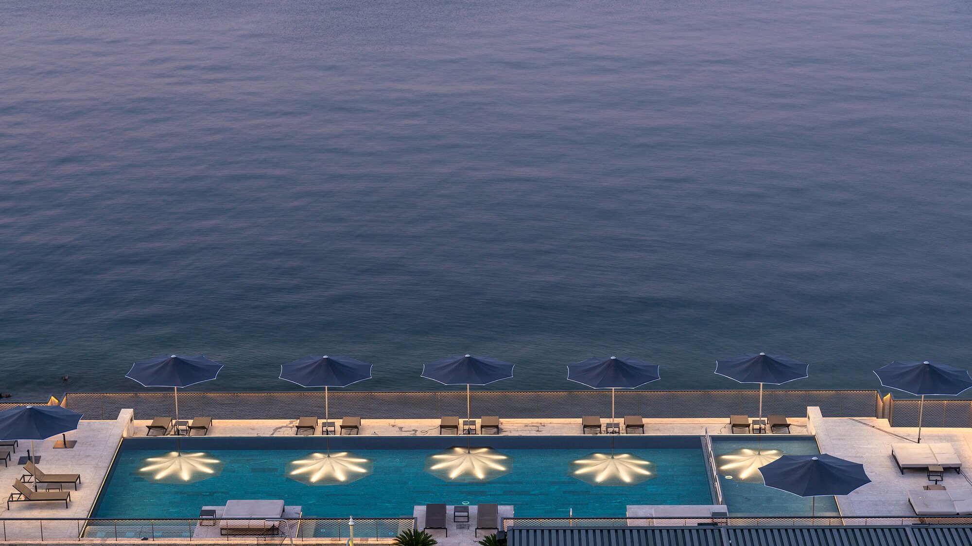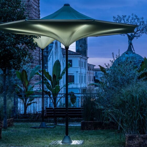 Parasol ogrodowy Pagoda FIM to wyjątkowy element wyposażenia przestrzeni zewnętrznych, który łączy klasyczny, orientalny design z nowoczesnymi rozwiązaniami technologicznymi. Jego charakterystyczna forma inspirowana azjatyckimi pagodami dodaje szyku i elegancji każdemu tarasowi, ogrodowi czy przestrzeni hotelowej. Wbudowane oświetlenie ambientowe sprawia, że po zmroku parasol nie tylko zapewnia ochronę, ale również tworzy nastrojową atmosferę. Parasol ogrodowy PAGODA ma zakrzywiony, wizualnie lekki dach, składający się z dwóch równych i przeciwległych części: górna chroni przed słońcem i deszczem, a dolna część tworzy duży, sklepiony sufit, który równomiernie rozprasza światło emanujące z wnętrza.