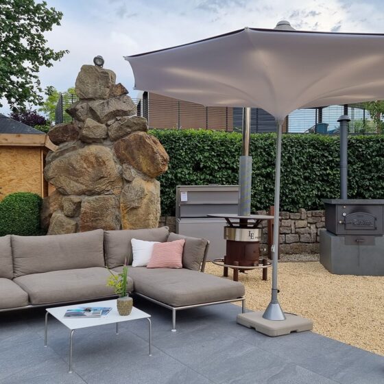 Konstrukcja parasola została zaprojektowana z myślą o stabilności nawet przy silniejszych podmuchach wiatru. Możliwość zastosowania cięższej podstawy zwiększa bezpieczeństwo użytkowania w otwartych przestrzeniach.