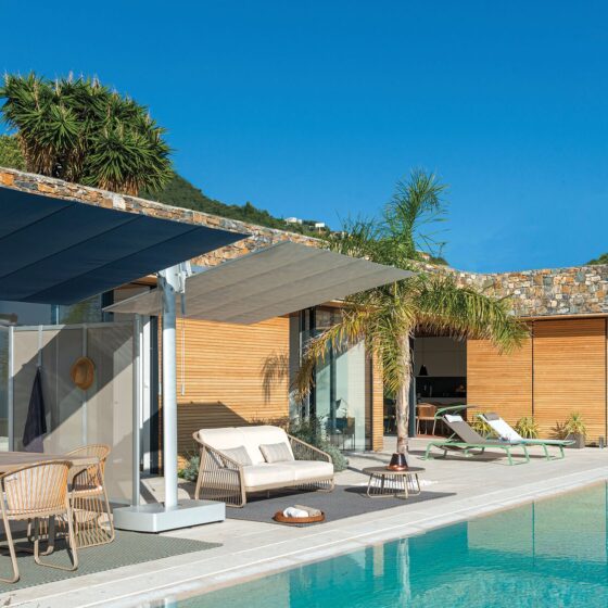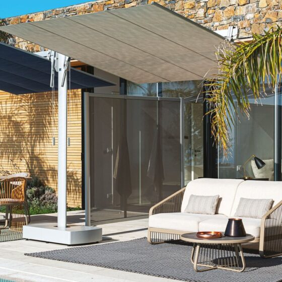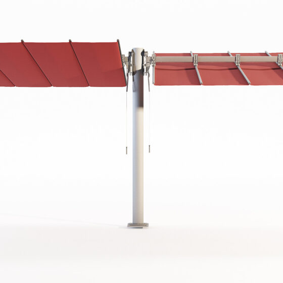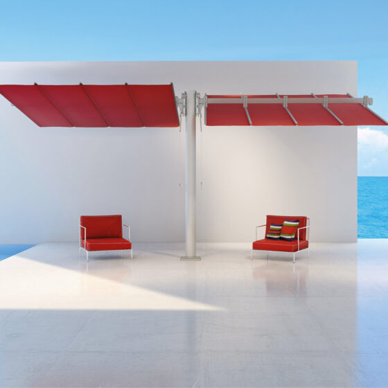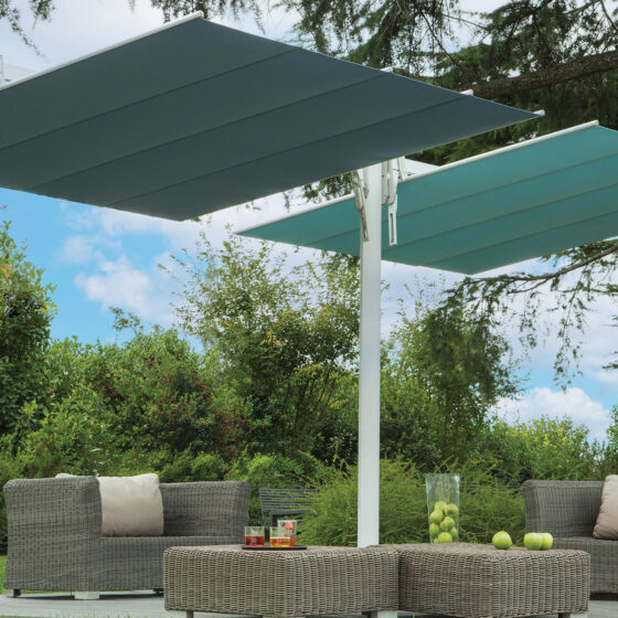 Dzięki modułowej budowie, parasol Flexy Twin składa się z dwóch niezależnych czasz umieszczonych na jednej centralnej konstrukcji. Taki układ zapewnia szeroki obszar zacienienia bez konieczności stosowania wielu pojedynczych parasoli.