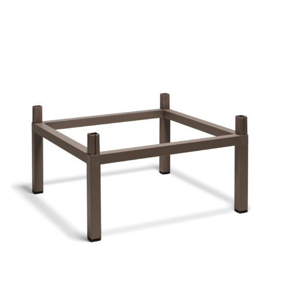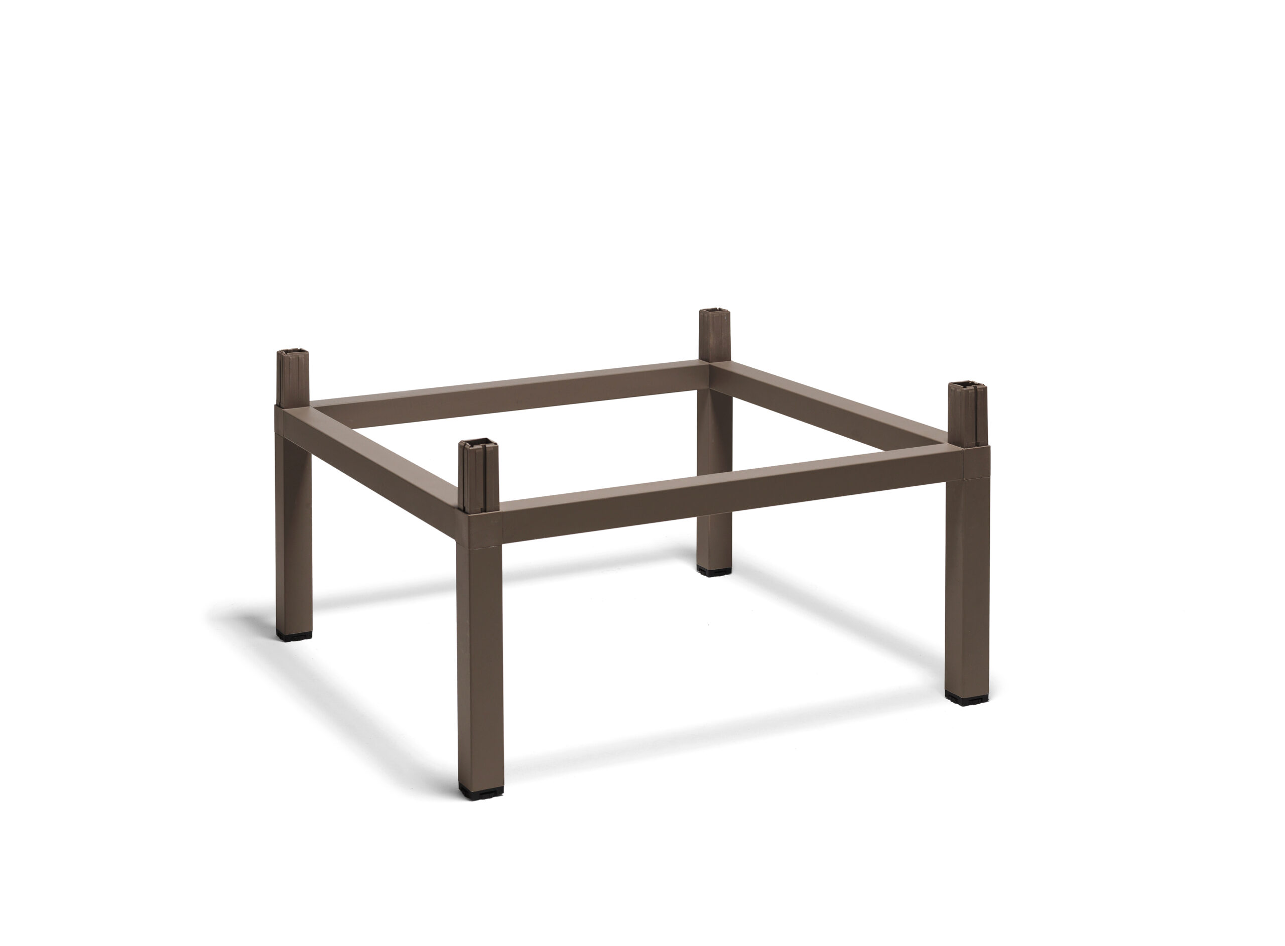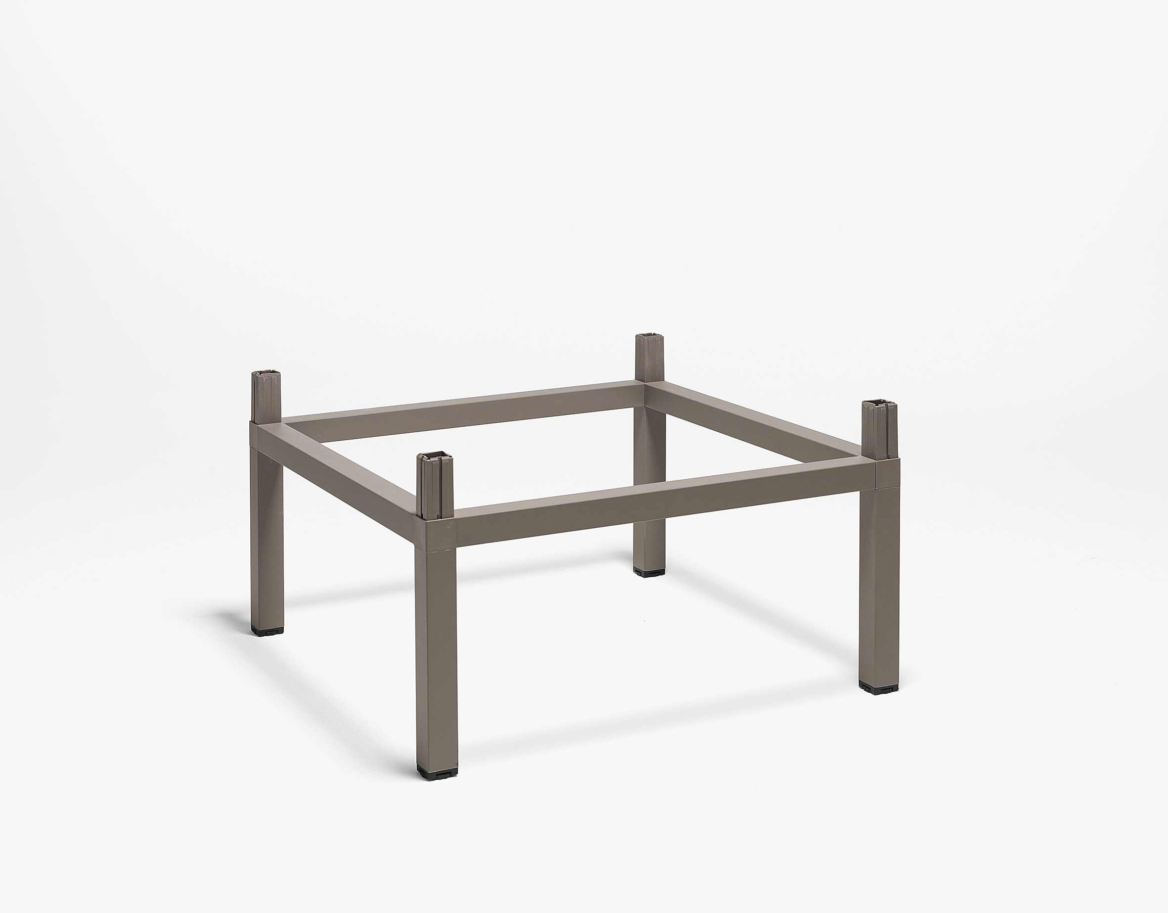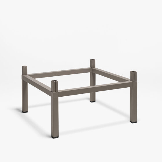 Podwyższenie do stołu Kit Cube 70 High wyposażono w wytrzymałe zakończenia z tworzywa, które chronią podłoże przed zarysowaniami i umożliwiają precyzyjne wypoziomowanie stolika na każdej nawierzchni. Farba proszkowa użyta do wykończenia nóg wykazuje wysoką odporność na środki czystości oraz promieniowanie UV, dzięki czemu mebel zachowuje swój pierwotny odcień przez długie lata użytkowania. Dzięki wyeliminowaniu metalowych śrub narażonych na korozję, cały zestaw jest w pełni bezobsługowy i gotowy do pracy w najbardziej wymagających warunkach pogodowych, od upalnego lata po mroźną zimę.