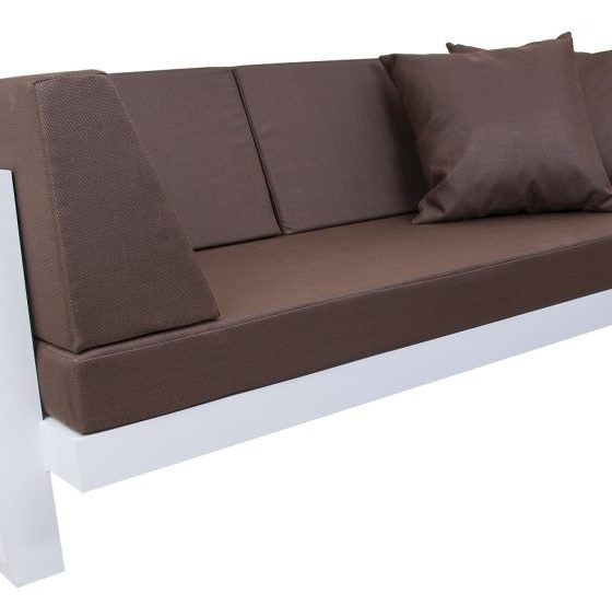 Sofa z kolekcji Toscania, kolekcja wypoczynkowa. Stelaż z aluminium z poduszkami w komplecie z tkaniny dralonowej (100% akryl) pokrytej teflonem. Idealna zarówno do domu lub na taras oraz do obiektów gastronomicznych – restauracje kawiarnie
