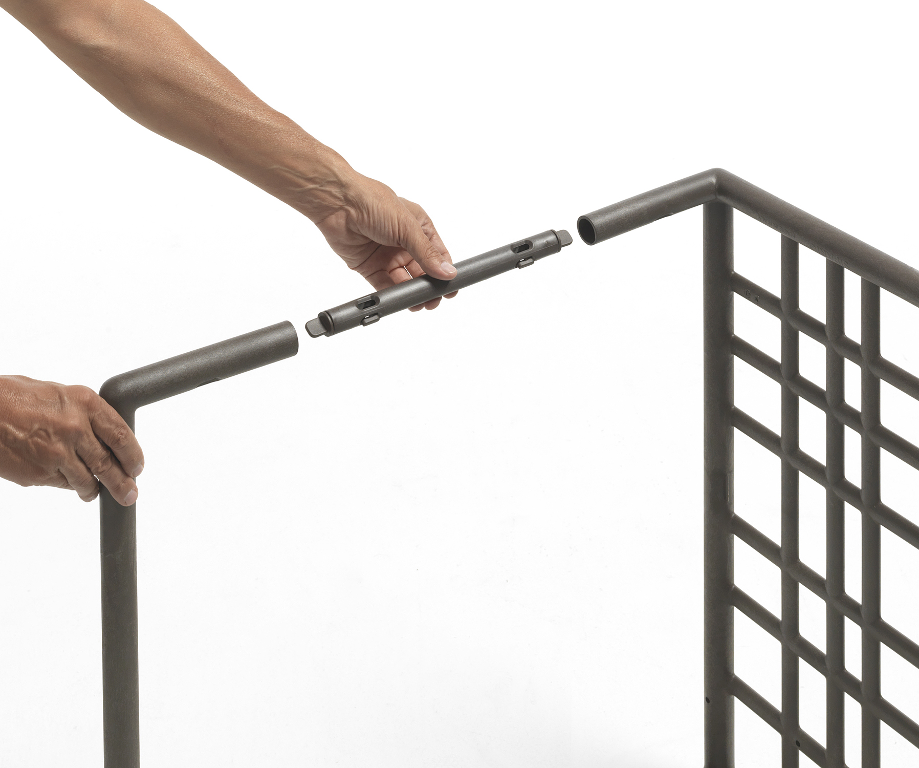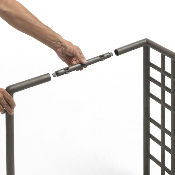 Projektując modułowy system ścian działowych Sipario , producent zadbał o to, by akcesoria były w pełni zintegrowane z resztą kolekcji. Chiusura wykonana jest z tego samego ekologicznego, regenerowanego polipropylenu, co gwarantuje identyczny odcień i matową teksturę. Dzięki temu element ten staje się niemal niewidoczny, tworząc płynne przejście z ramą modułu. Jest on w pełni odporny na warunki atmosferyczne, co gwarantuje, że wykończenie nie wyblaknie i nie odkształci się pod wpływem słońca czy deszczu.